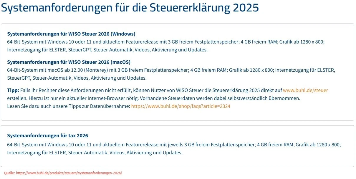 - Internetverbindung für Download, Aktivierung und ELSTER erforderlich