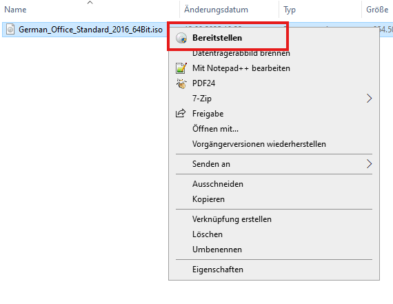 2. Rechtsklick auf die ISO-Datei und „Bereitstellen“ auswählen.