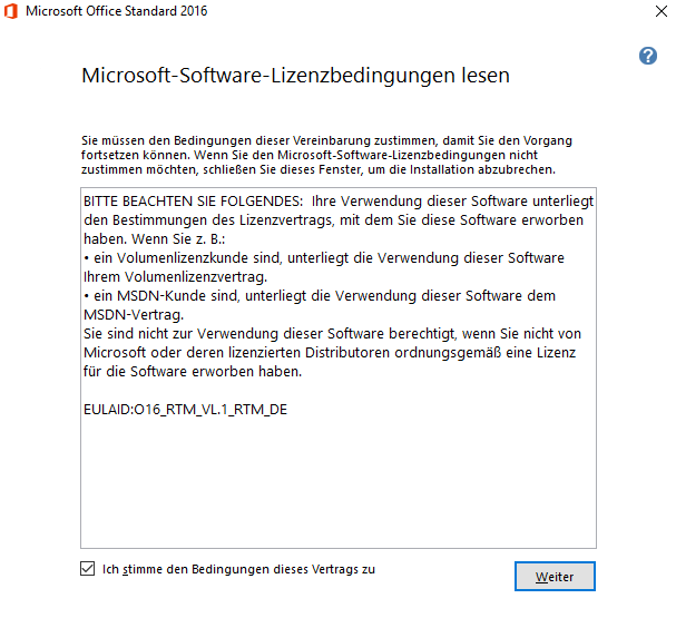 6. Den Haken bei „Ich stimme den Bedingungen dieses Vertrages zu“ setzen und auf „Weiter“ klicken.
