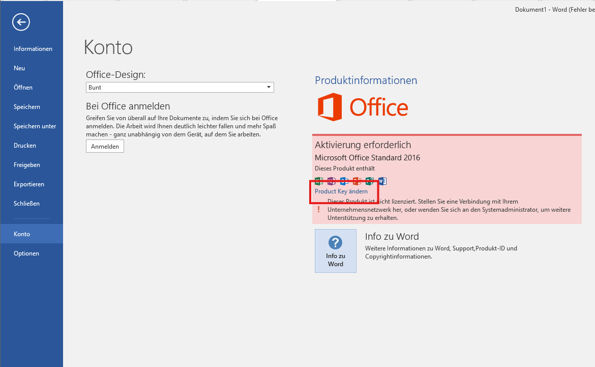 10. Wenn Sie Word geöffnet haben, erscheint meist zunächst der Lizenzvertrag-Dialog, dem Sie zustimmen müssen, um das Programm nutzen zu können. Anschließend wechseln Sie in den Kontobereich, um den Produktschlüssel zu ändern. Klicken Sie dort auf „Product Key ändern“, um den neuen Produktschlüssel einzugeben.