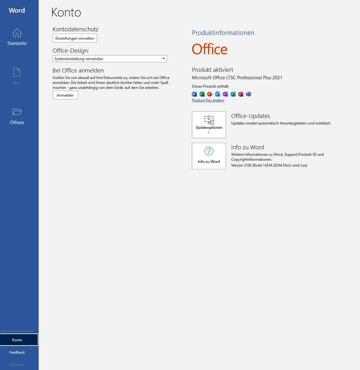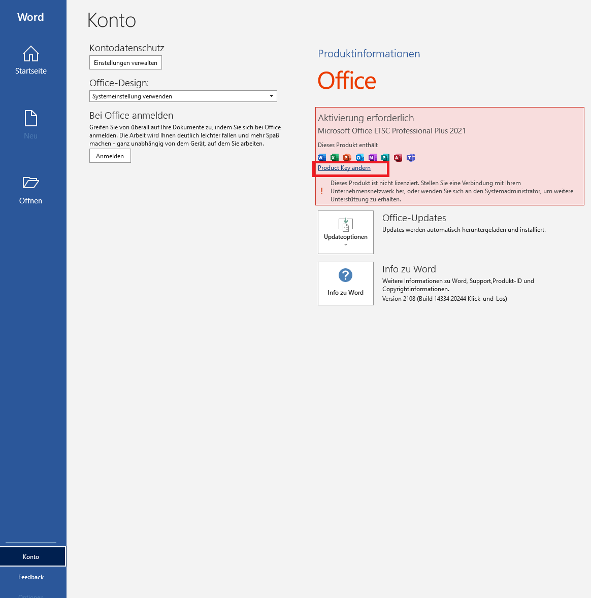 8. Wenn Sie Word geöffnet haben, erscheint meist zunächst der Lizenzvertrag-Dialog, dem Sie zustimmen müssen, um das Programm nutzen zu können. Anschließend wechseln Sie in den Kontobereich, um den Produktschlüssel zu ändern. Klicken Sie dort auf „Product Key ändern“, um den neuen Produktschlüssel einzugeben.