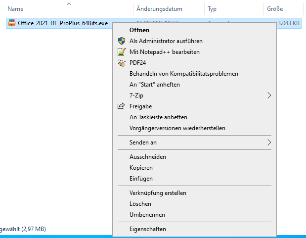 2. Führen Sie die heruntergeladene Datei als Administrator aus, indem Sie mit der rechten Maustaste auf die .exe-Datei klicken und mit der linken Maustaste auf „Als Administrator ausführen“ klicken. Hinweis: Sollte diese Option nicht angezeigt werden, wählen Sie die Datei zunächst mit einem einzelnen Linksklick aus und machen anschließend einen Rechtsklick darauf