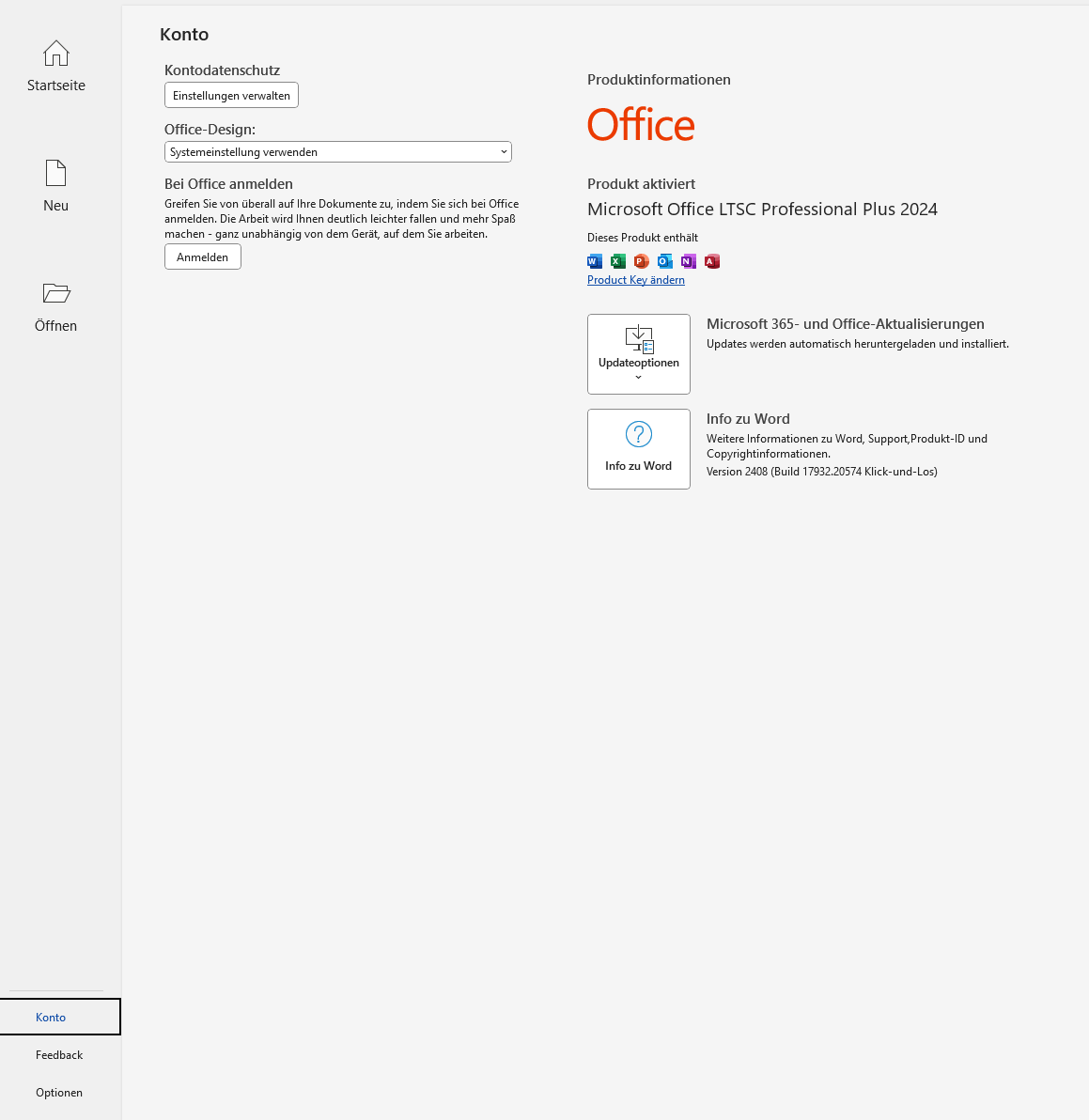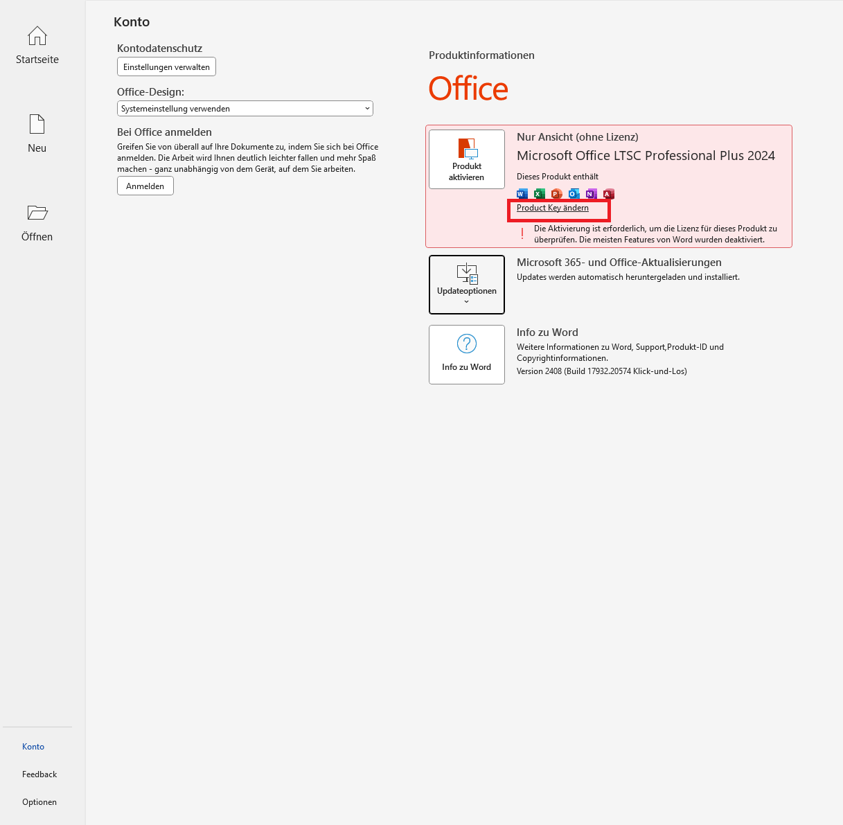 8. Wenn Sie Word geöffnet haben, erscheint meist zunächst der Lizenzvertrag-Dialog, dem Sie zustimmen müssen, um das Programm nutzen zu können. Anschließend wechseln Sie in den Kontobereich, um den Produktschlüssel zu ändern. Klicken Sie dort auf „Product Key ändern“, um den neuen Produktschlüssel einzugeben.