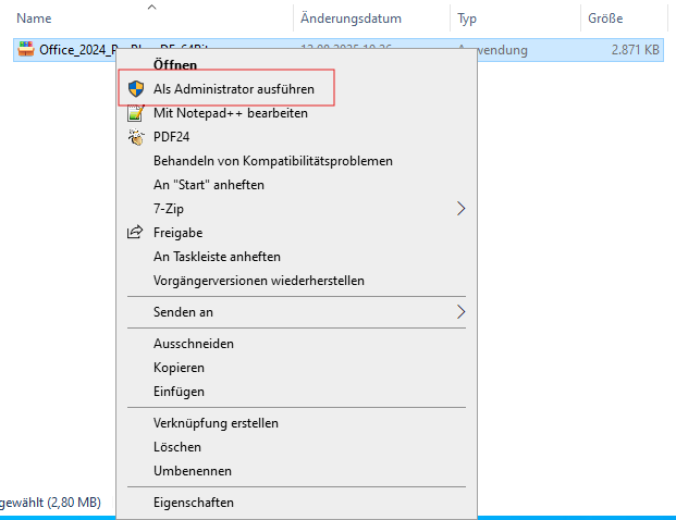 2. Führen Sie die heruntergeladene Datei als Administrator aus, indem Sie mit der rechten Maustaste auf die .exe-Datei klicken und mit der linken Maustaste auf „Als Administrator ausführen“ klicken. Hinweis: Sollte diese Option nicht angezeigt werden, wählen Sie die Datei zunächst mit einem einzelnen Linksklick aus und machen anschließend einen Rechtsklick darauf