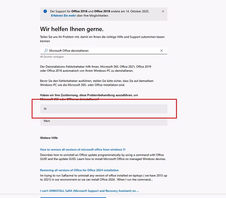 Der folgende Originalprozess von Microsoft läuft wie folgt ab: Die Problembehandlung für die Deinstallation wird gestartet. Die Bildschirmanweisungen werden schrittweise angezeigt. Am Ende wird zum Neustart des Computers aufgefordert. Der Neustart ist notwendig, damit alle Office-Bestandteile vollständig entfernt werden.